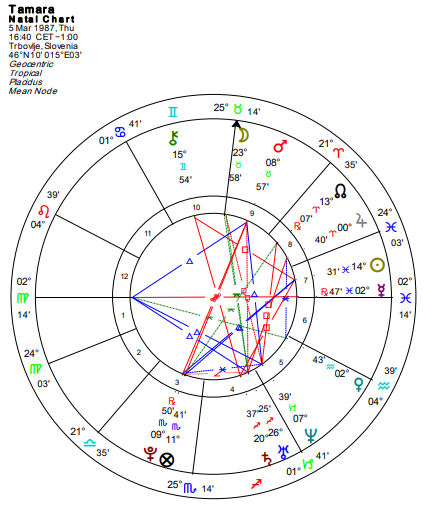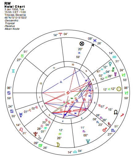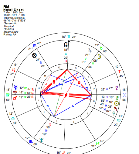 Opozicija Neptuna i Venere ukazuje na teškoće u postavljanju granica u odnosima i potpunu predaju potrebama drugih. Kuća počinje u Blizancima, a vladar Merkur se nalazi u Raku u 12. kući, što doprinosi emotivnoj osetljivosti i nervozama.