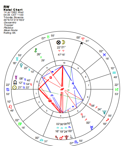 - Maligna oboljenja: Retrogradni Mars, vladar 8, teško aspektiran na Ascendentu, sugeriše na potencijalno maligna oboljenja, posebno s obzirom na konjunkciju s retrogradnim Plutonom i Uranom, te opoziciju sa Suncem i Hironom iz 6. kuće.